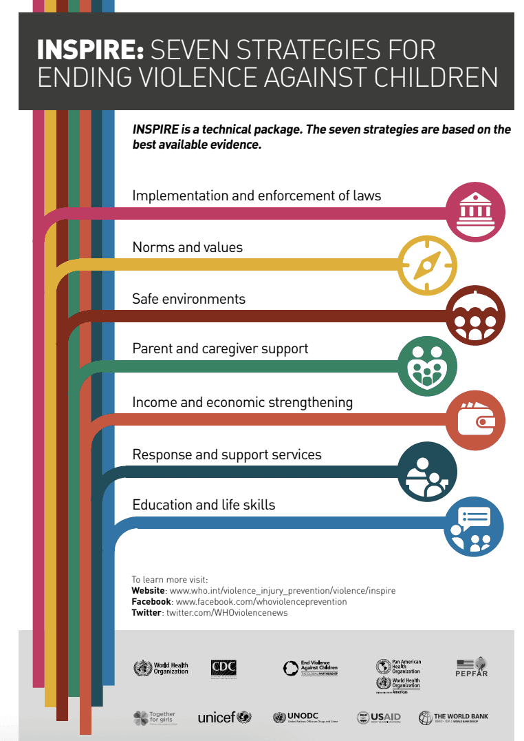 INSPIRE is a set of 7 evidence-based strategies designed to support countries and communities to intensify their focus on prevention programmes and services in order to reduce violence against children: