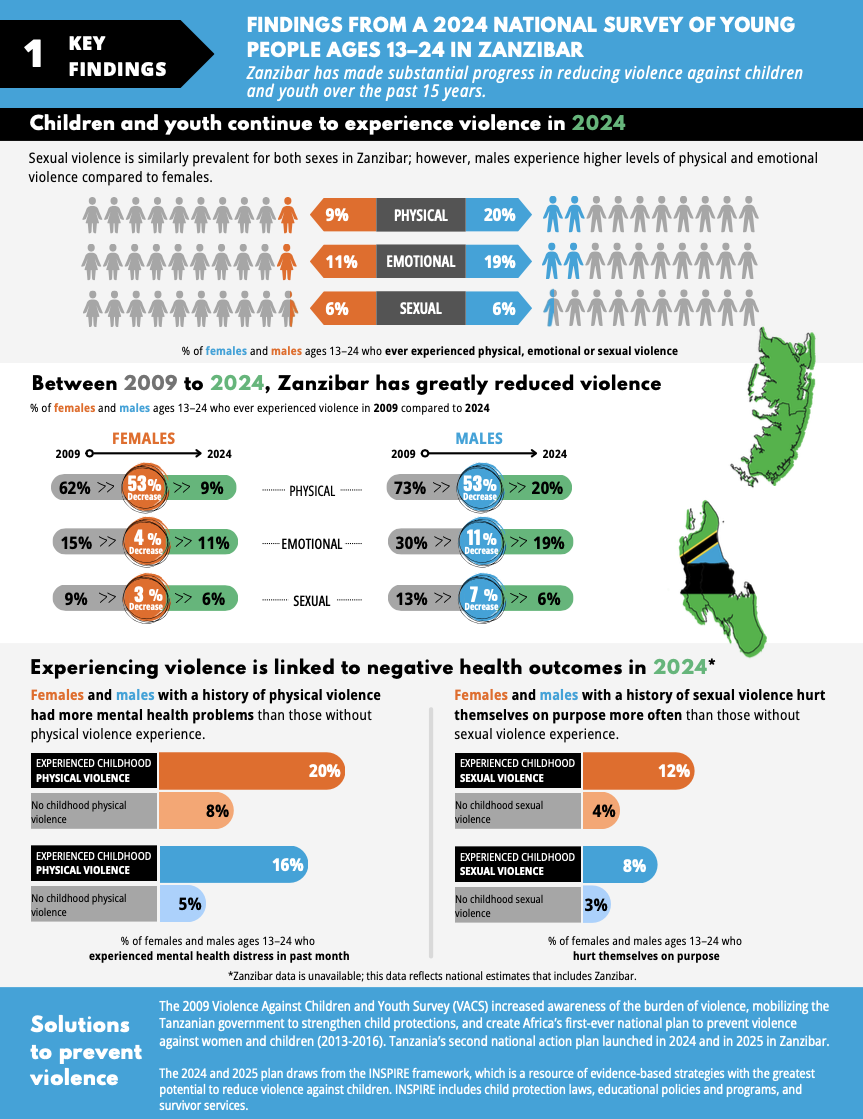 In 2024, the Government of Tanzania launched the second Violence Against Children and Youth Survey (VACS) to measure progress made since the 2011 VACS, and identify emerging trends in violence against children, with technical assistance from the Centers for Disease Control and Prevention (CDC), as part of the Together for Girls partnership. This fact sheet provides an overview of the data found in Zanzibar's second VACS report, conducted in 2024.